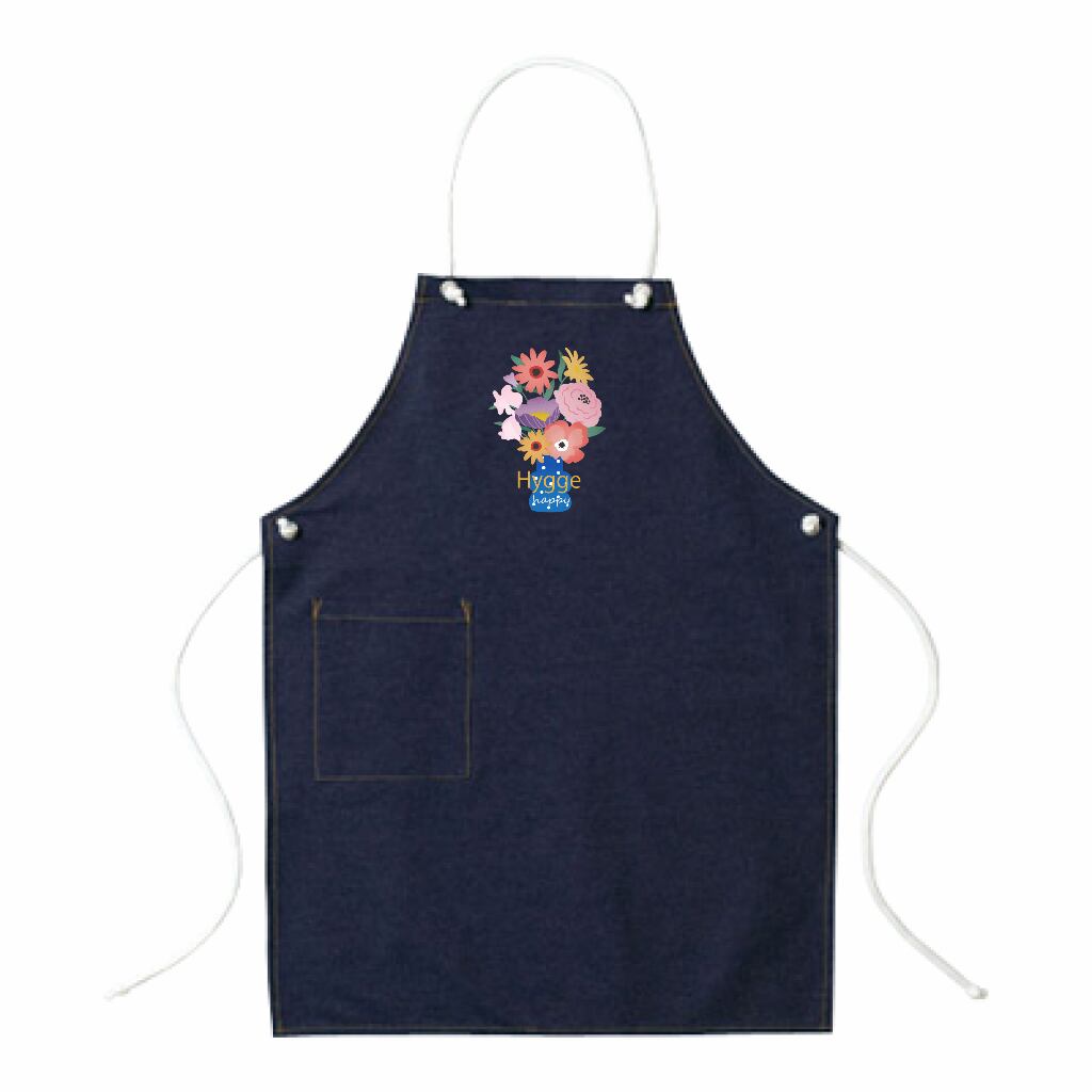 カジュアルな質感と染色がアクセントになるデニム生地のエプロンにカラフルなお花が映えるエプロンです。